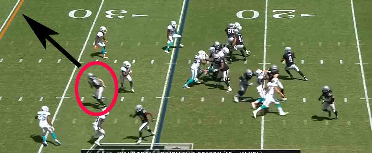 Not only that, but Drake can be (not always, but can be) a liability in blocking. With the Raiders leading by 10, this is the play where Grant (circled) caught a quick shuffle and took it 18 yards. In the box, you see Kenyan Drake drilling a dude from behind. That could have been called an illegal block in the back. And depending on the ref’s angle, he could also be called for leading with the helmet. Either way, it is a clear and obvious penalty.